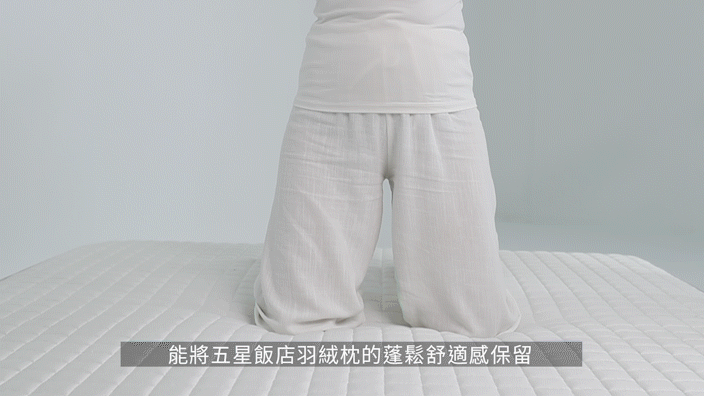 我們經過兩年實驗,將羽絨跟Perquiss®彈纖維混合在一起,兩種物質竟然碰撞出一種奇特觸感,這種觸感類似記憶枕的慢回彈,於是我們將這個新物質取名叫做『記憶羽纖』。