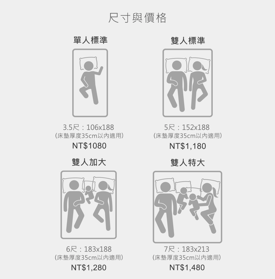 ●尺寸:單人3.5尺、雙人5尺、雙人加大6尺、雙人特大7尺