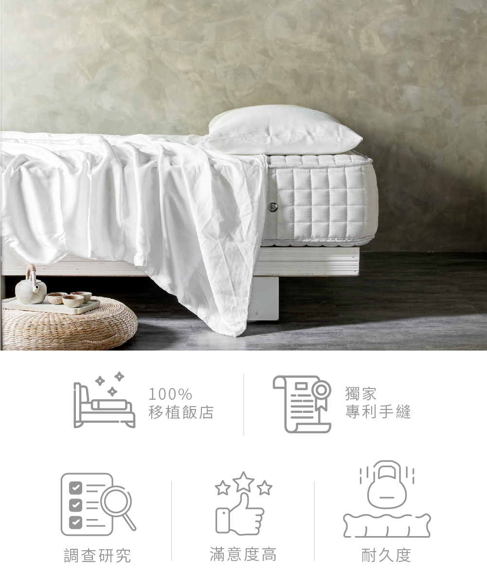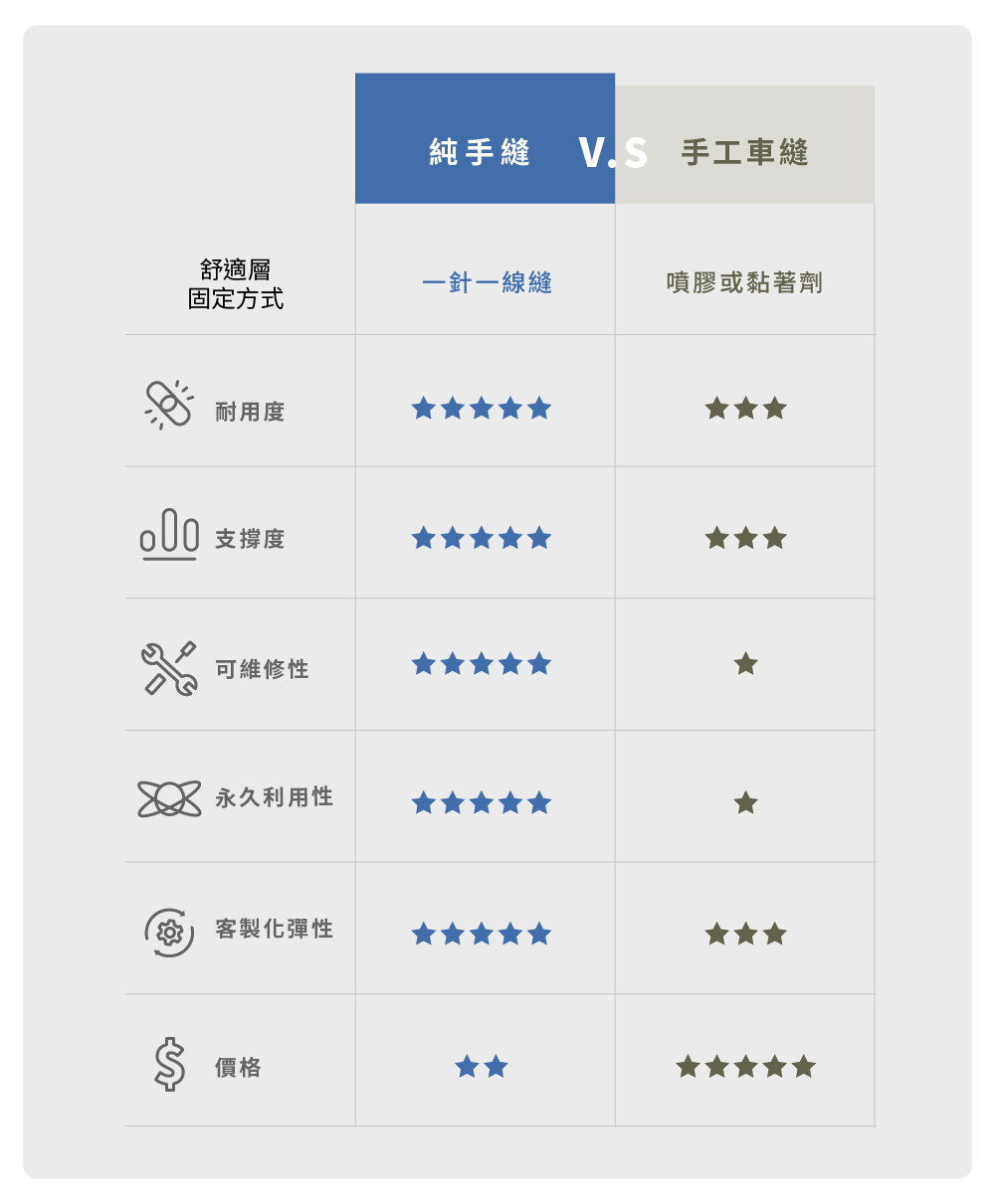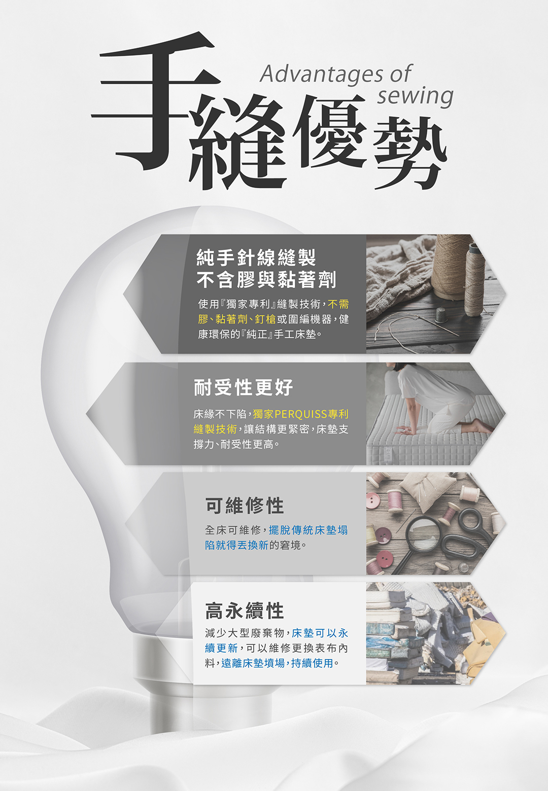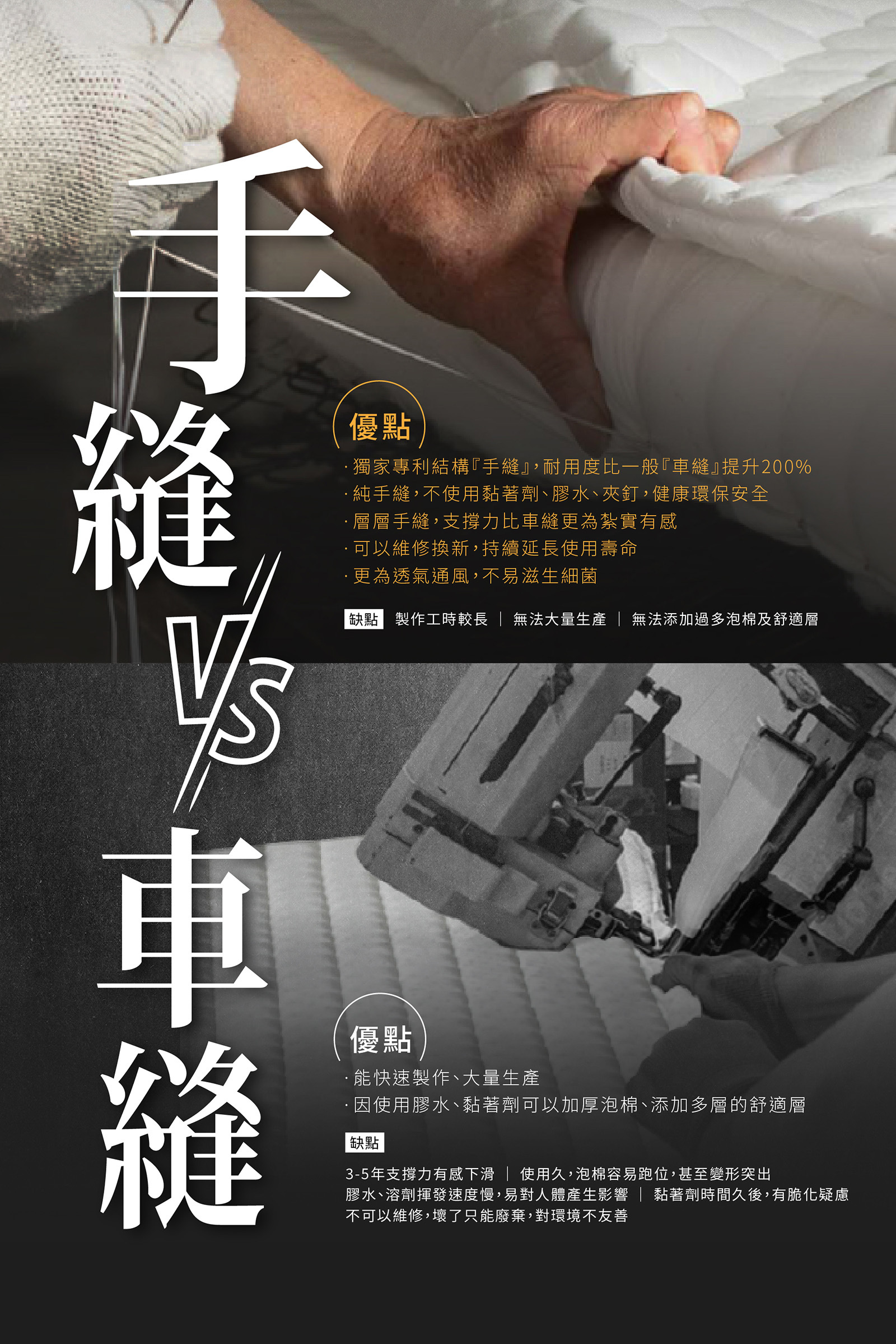 獨家專利手縫技術,能讓泡綿、彈簧、舒適層緊密結合再一起,不需使用膠水、釘槍就能完整固定,這樣的工法甚至能讓耐用度跟支撐度更為提升UP!。