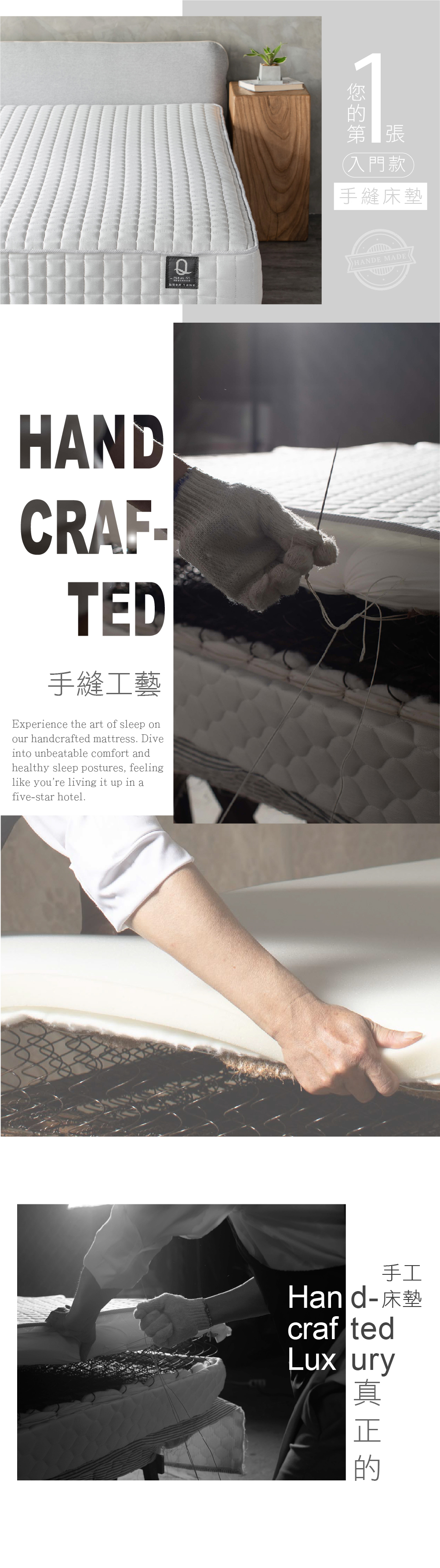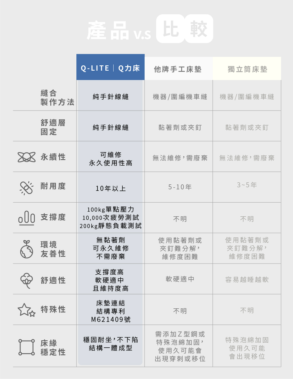 『Q-LITE|Q力床 』使用『專利手縫技術』傳承百年技藝,一針一線縫出耐用好床,台灣職人製造,讓你不用十萬、百萬,就能入手享受到『純手縫製床墊』好睡體驗。