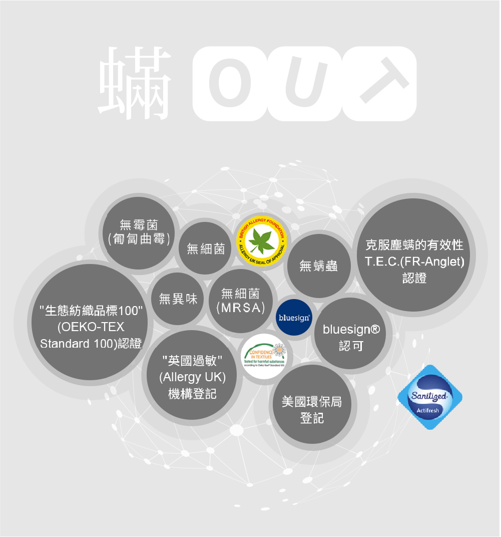 『Q-LITE|Q力床 』使用瑞士防蟎抗菌科技,將蟎蟲通通OUT出去,表布透氣不悶熱,給你清新健康得睡眠環境。
