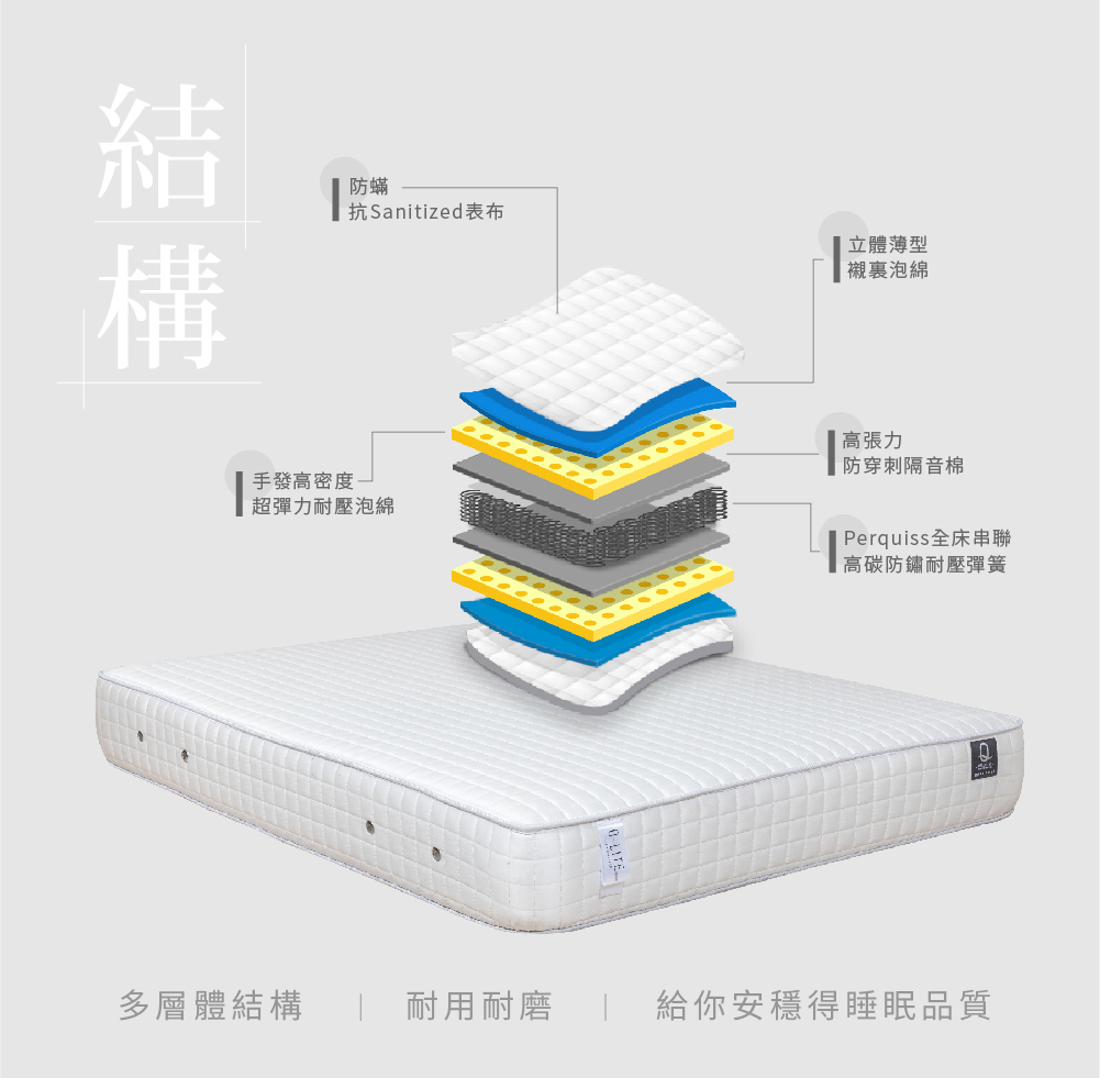『Q-LITE|Q力床 』為多層體結構,透過專利手縫技術,一針一線將每一層牢牢固定在一起,舒適耐用,給你安穩得睡眠品質,傳統床墊只有正面可以睡,『Q-LITE|Q力床 』正反面皆可以睡,讓床墊使用年限跟壽命大大延長