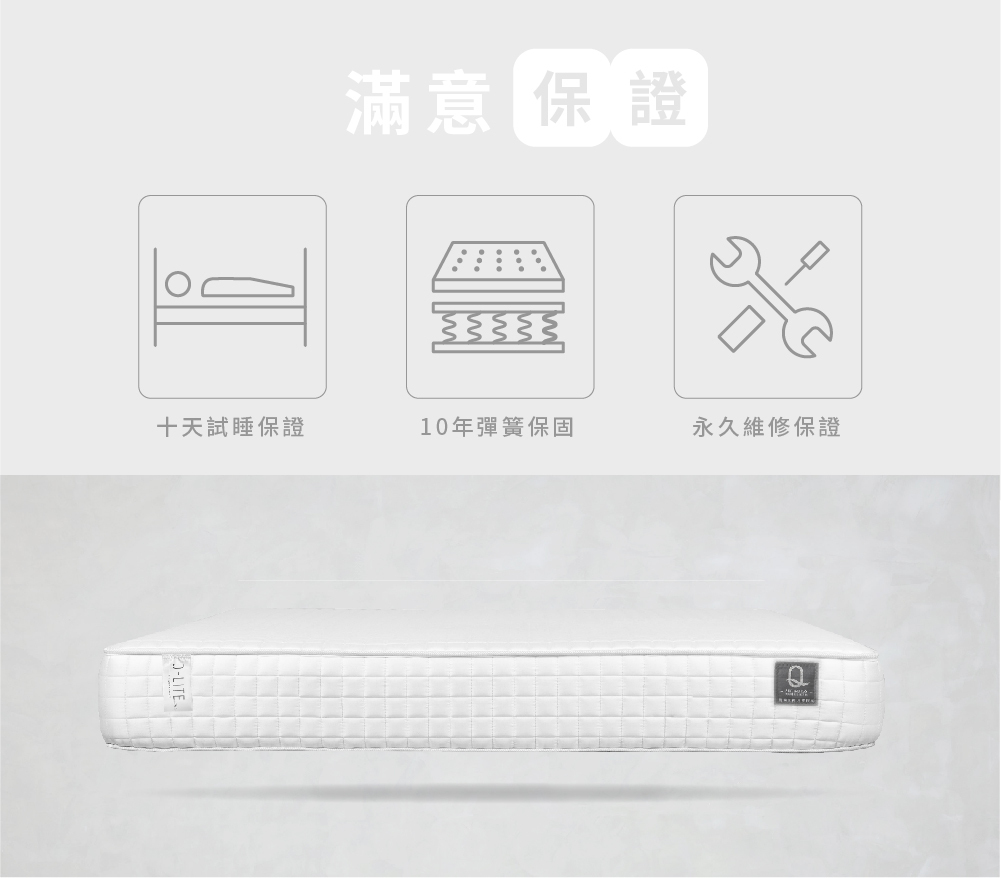 在正常使用人體躺臥的情況下,Q-LITE彈簧保固10年內免費更換,保證臀部及床沿不塌陷,並負擔首次申報維修往返運費;後續其他需要維修更換的地方,僅酌收材料手工費用,讓您的床墊使用年限無限延長。