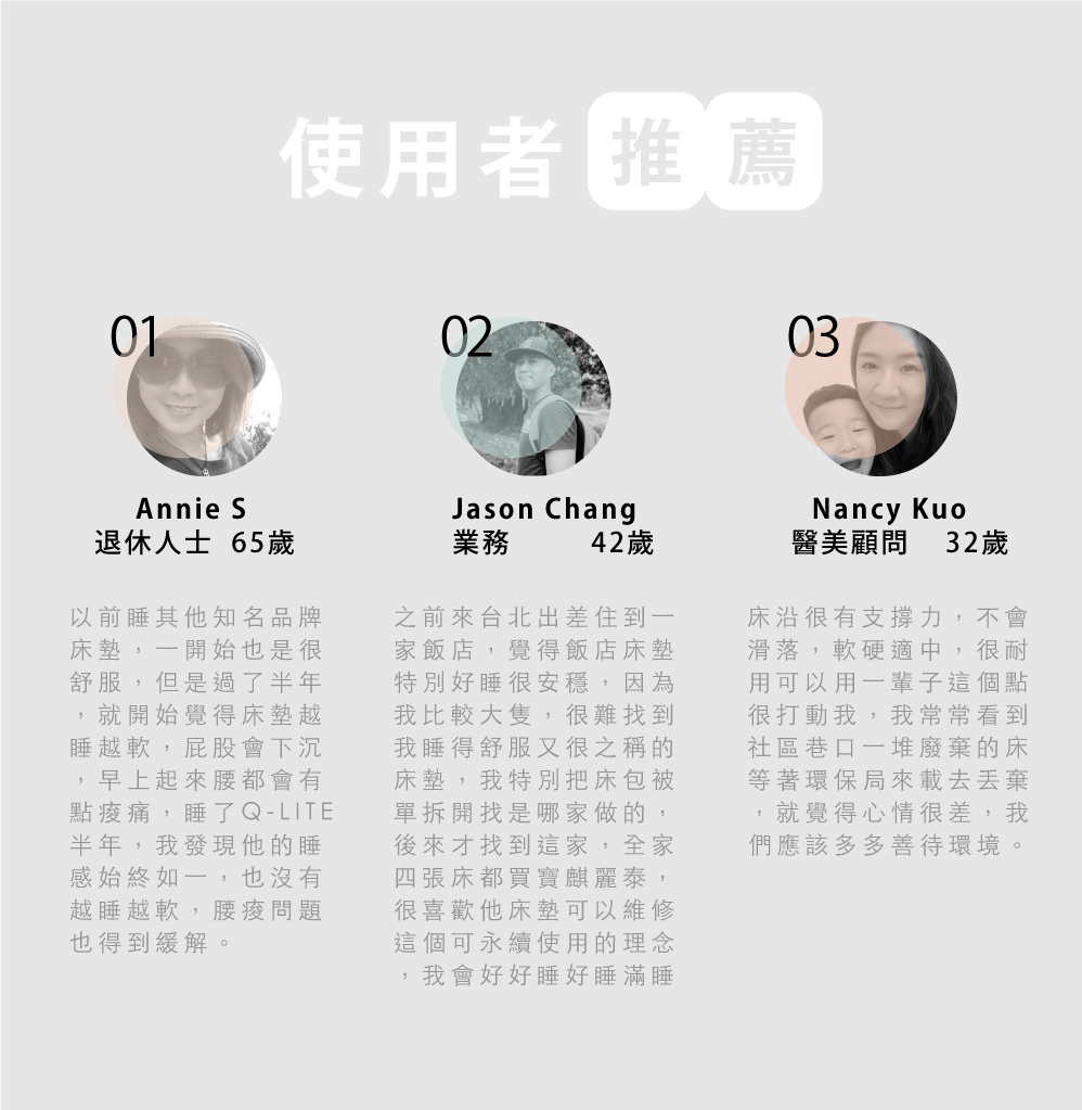 當『好睡』是床墊必要條件,耐用度就會是你的首要選擇,『Q-Lite|Q力床』是你買回去不用操心忠實可靠的『家人』,可以陪伴你永久,永久所有零件可以維修,不論是破皮、損壞,不再痛心要送家人去『床墊墳場』成為大型廢棄物,也不用擔心失去熟悉的陪伴。