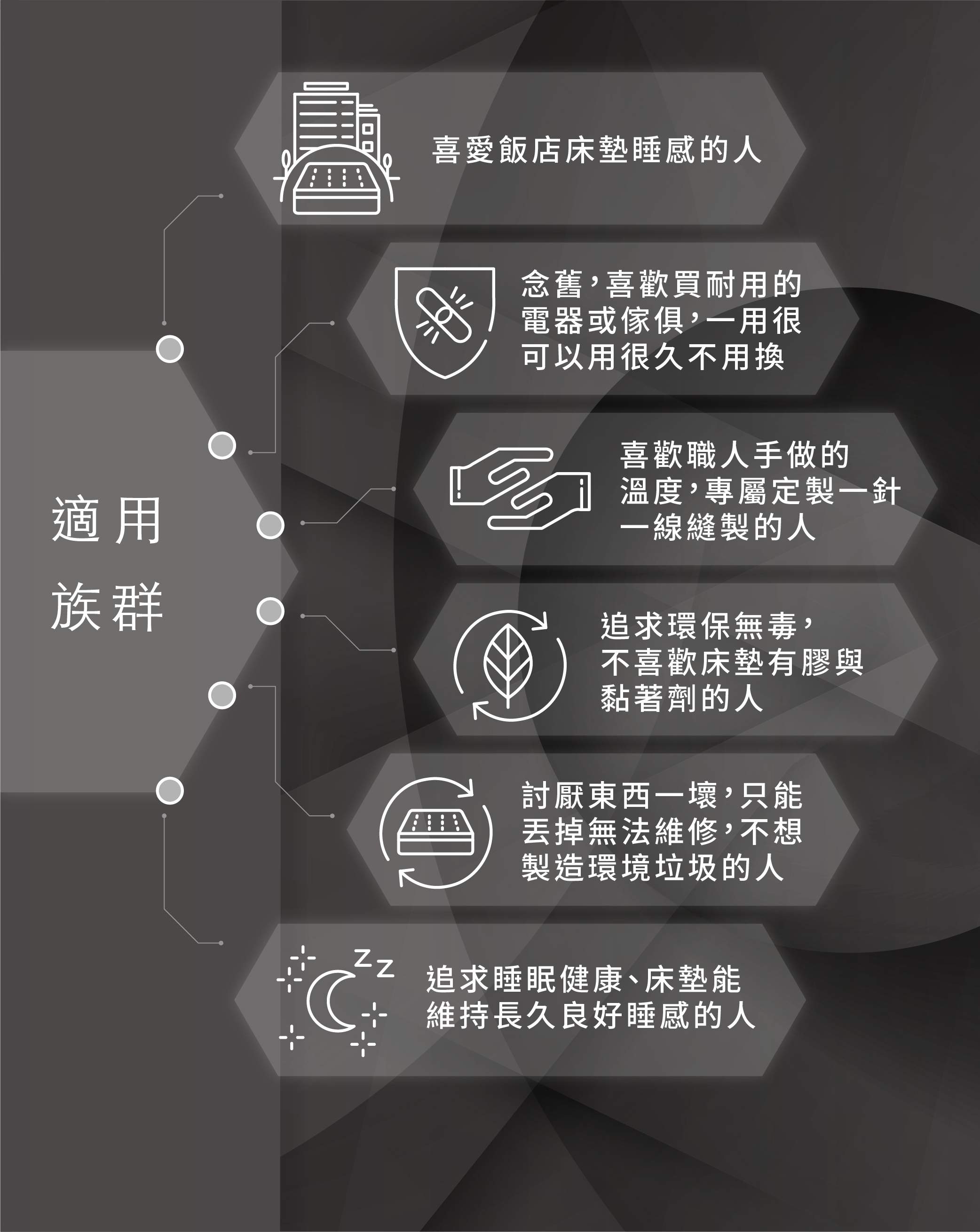 永久可維修,床墊有問題不需廢棄換新,所有零件皆可維修,不製造環境負擔。