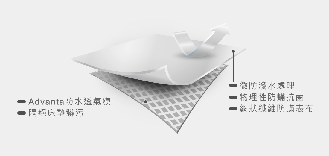 『無存在感防水Q氧被套』,使用Advanta高科技防水透氧膜,100%防水,阻絕髒汙,降低傳統防水被套的悶熱不透氣感,會呼吸的防水透氧層。