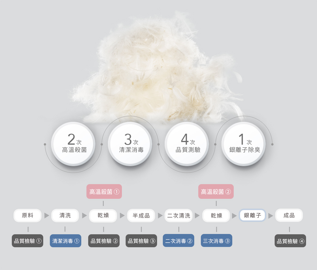2道高溫殺菌+3道消毒程序+4次品管檢測,不過度清潔漂洗,降低破壞羽絨毛結構同時造成自然環境污染與負擔。