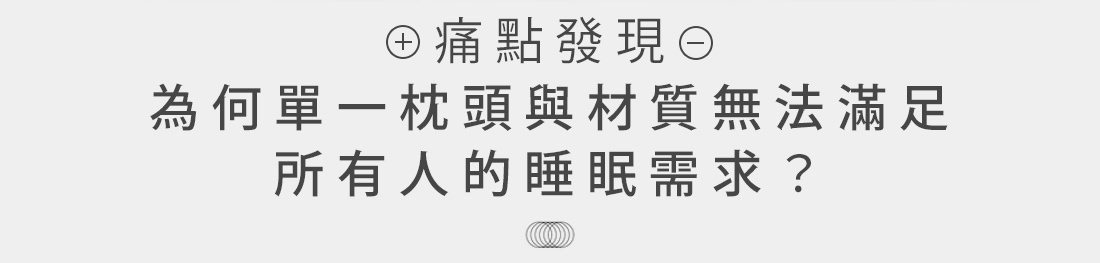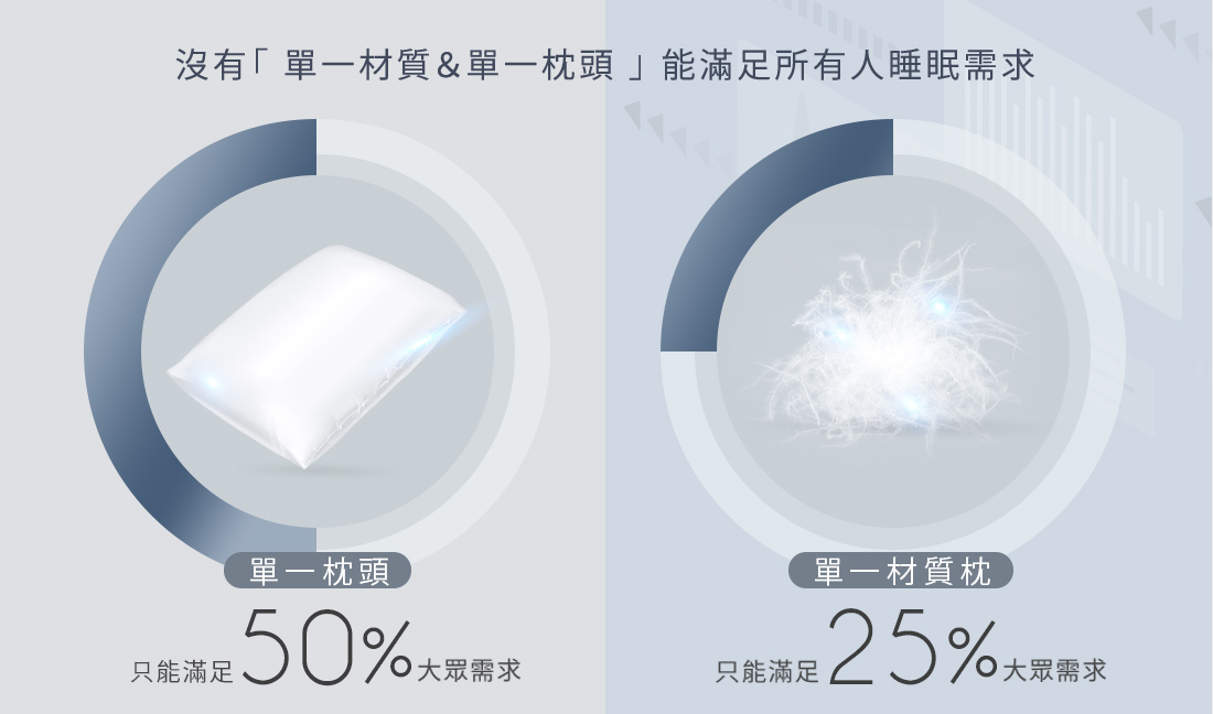 我們發現每個人對於睡眠需求每天都不同,「 單一種材質」或「單一顆枕頭 」,早已無法能滿足多變的需要。