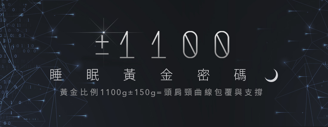 我們研發「人因正負枕」的過程中,試驗獲得神奇的1100密碼,以此1100為中心,上下 ±加減150g創造出來的正負枕,疊加在一起使用,竟然意外能讓肩頸獲得到一個黃金的平衡。不僅改善了「純羽絨」會有支撐力不足容易塌陷的疑慮,讓睡感軟中帶靠;並且滿足90%以上的試睡樣本。