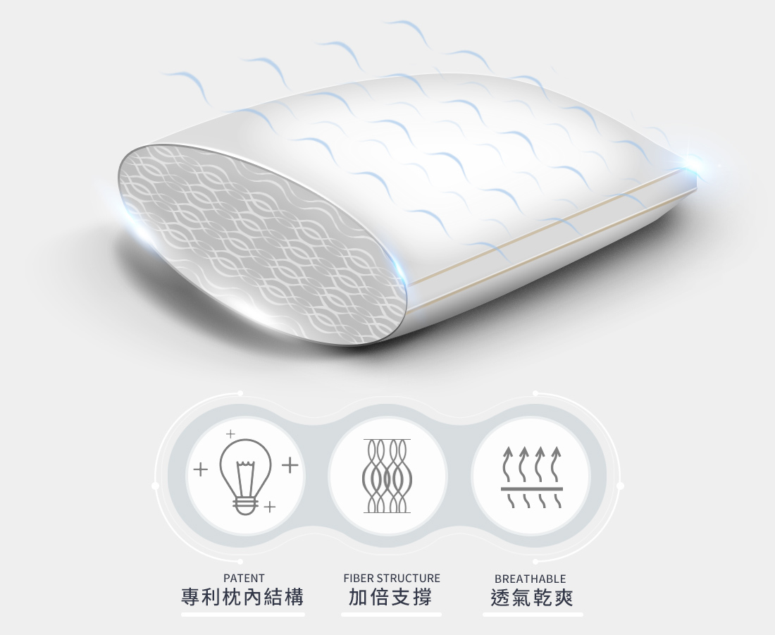 3D立體彈性側邊,讓枕頭透氣不悶熱,內部加大羽絨倉空間,使羽絨完整舒張,增加支撐。