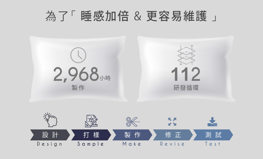 團隊結合五星飯店『 羽絨上下枕 』開發經驗,開啟『 人因正負枕 』∞無限循環的研發歷程...一切只為了讓「 睡感加倍 」+「 維護簡便 」