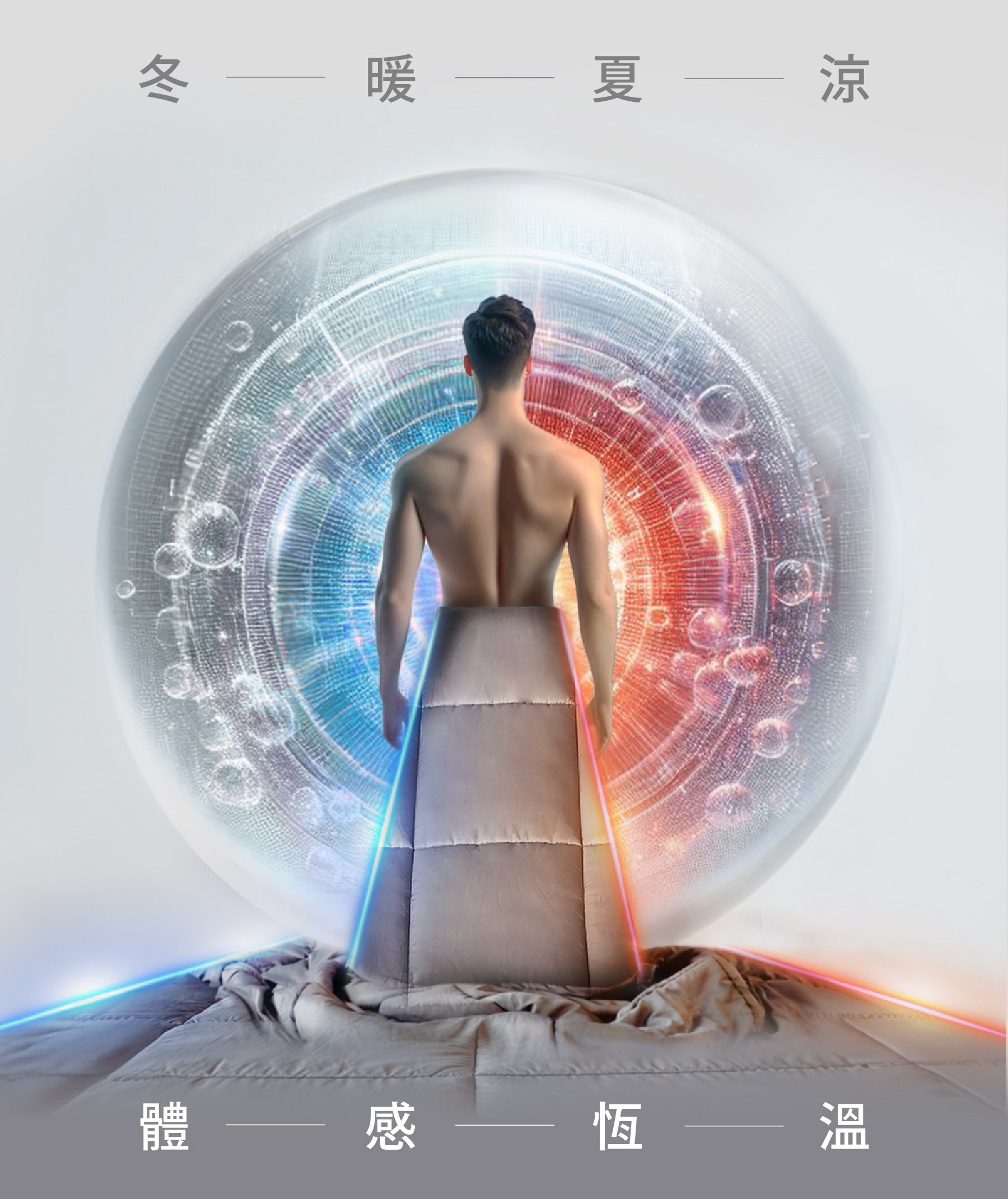 就像地球的大氣層一樣,我們的『溫室被』專門設計來捕捉和保留身體的熱量。這種獨特的設計使被子在冬天提供足夠的保暖,而在夏天則保持涼爽,確保您全年都有最佳的睡眠溫度。>