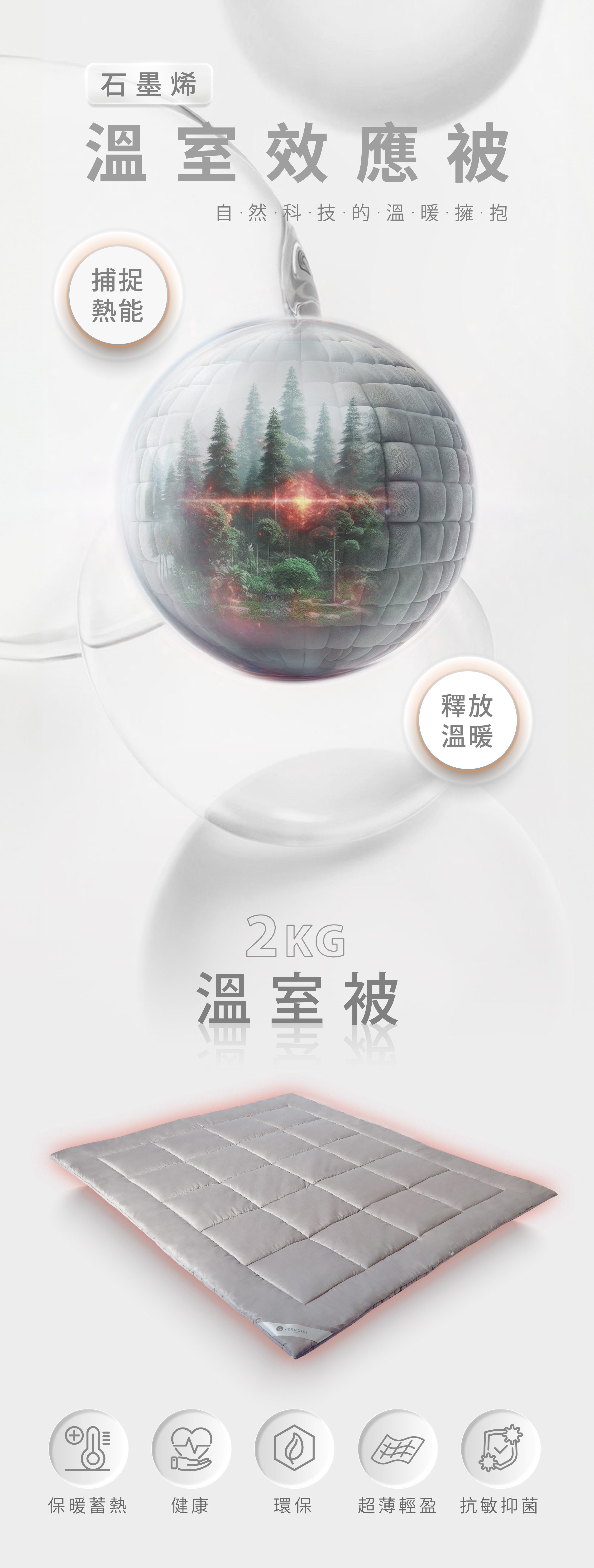 石墨烯擁有的世界上最高散熱係數(5300W/mk),高於奈米碳管和金剛石,是銅的近14倍,石墨的3.5倍。散熱特性可以幫助調節溫度,在導熱功能上,與其他纖維相比,可提昇10~15%熱傳導速率。『溫室被』在各種環境下都能享受到舒適的睡眠並讓一整晚睡眠都能維持在理想溫度上。